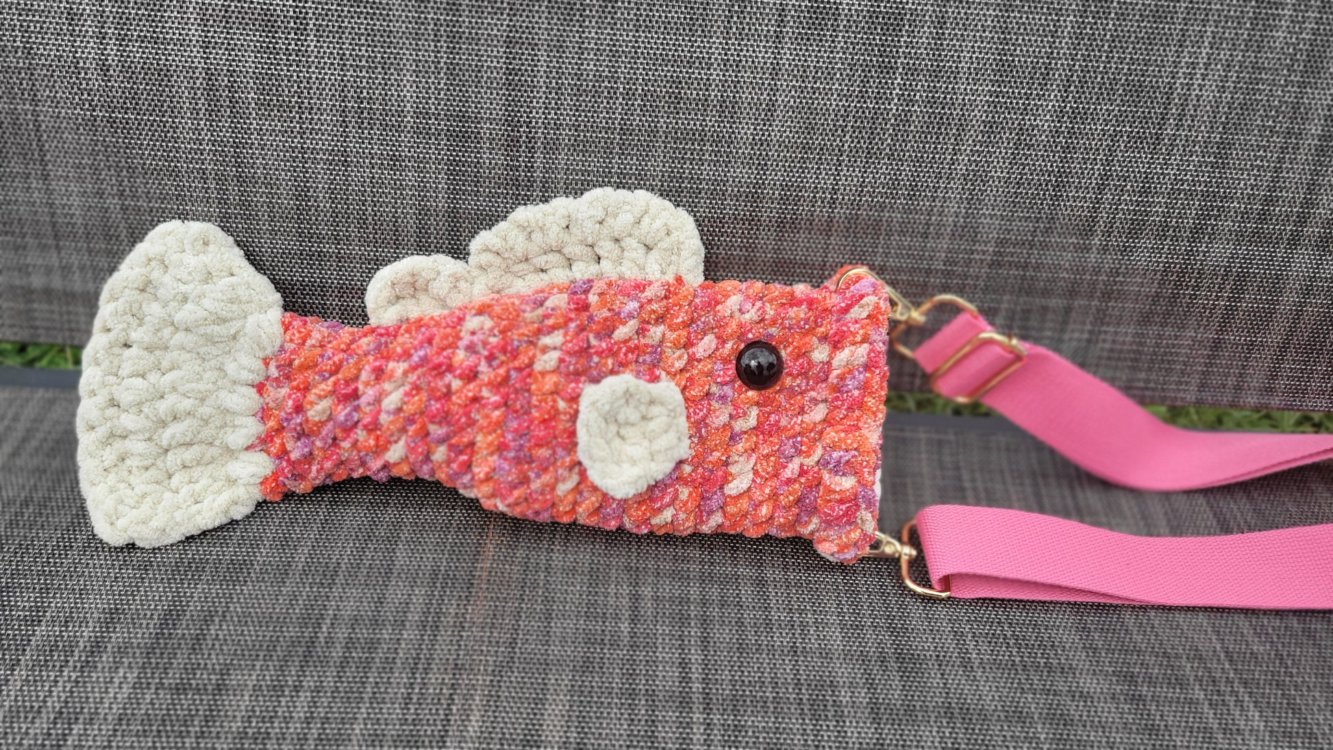 These crossbody fish bags are designed to look like a classic largemouth bass fish. They are sturdy, versatile, and made with lusciously soft yarn. Fits a variety of items such as most phones, wallets, and other treasures or trinkets. Perfect as a gift for any fish lover or as an every-day crossbody bag. Each fish comes with magnetic snaps to close the mouth, an adjustable strap, and a false bottom so your trinkets won't fall into the tail end.
