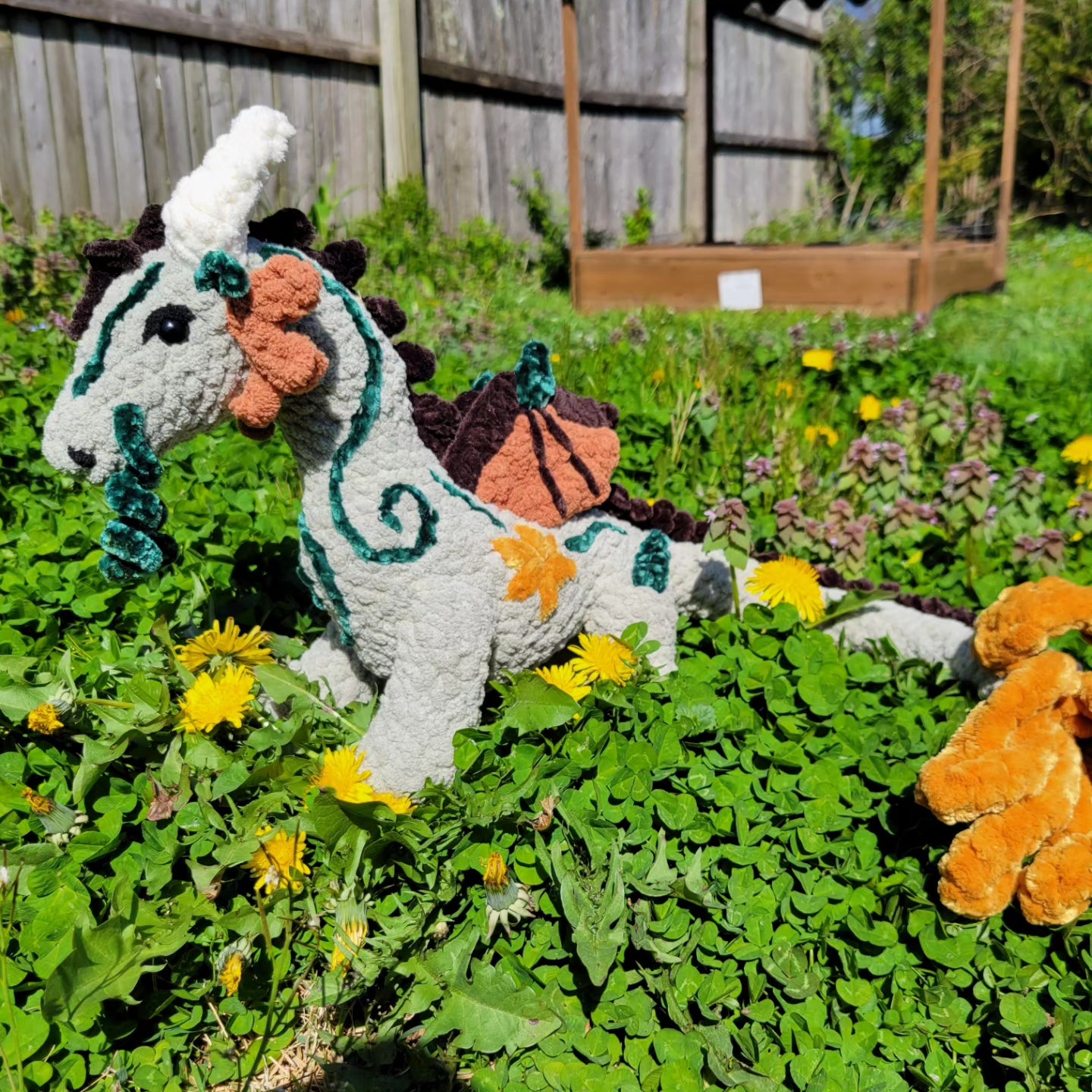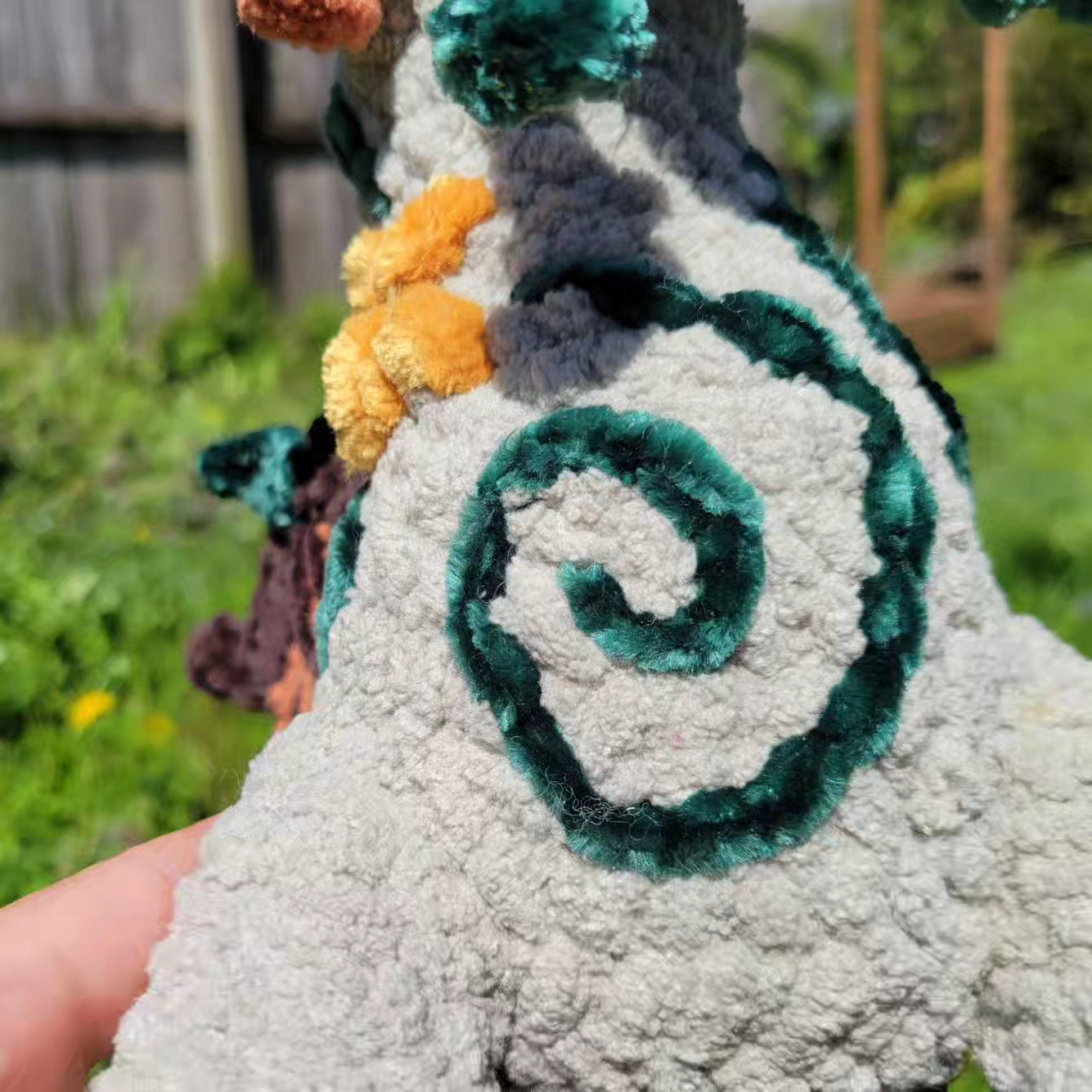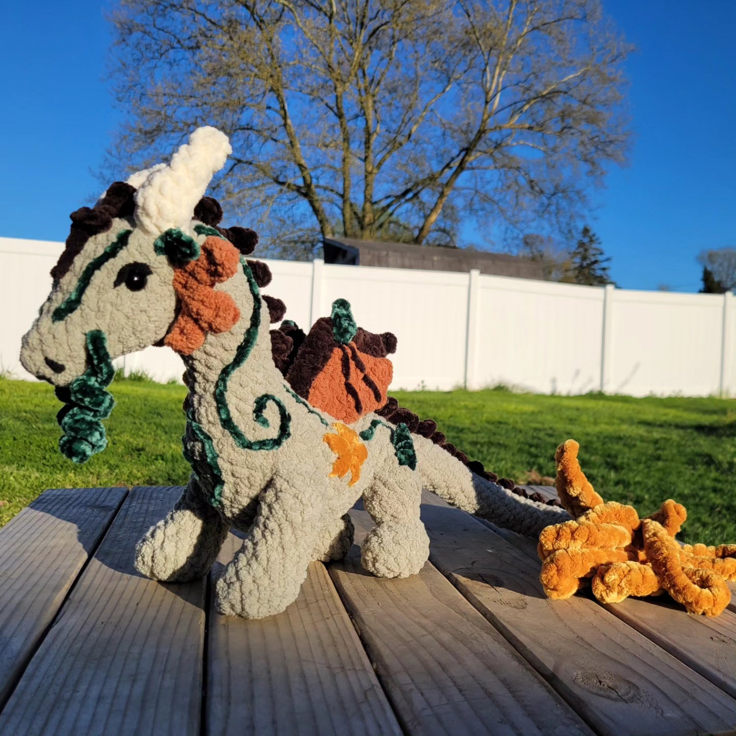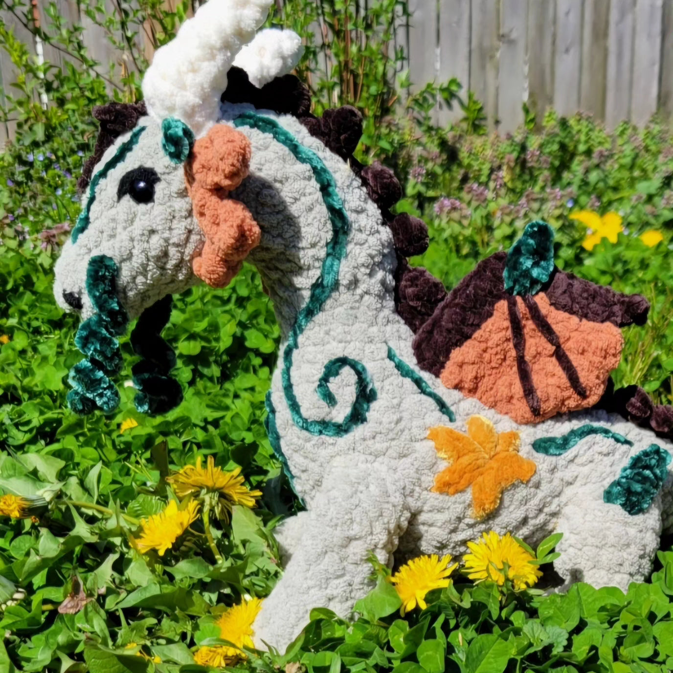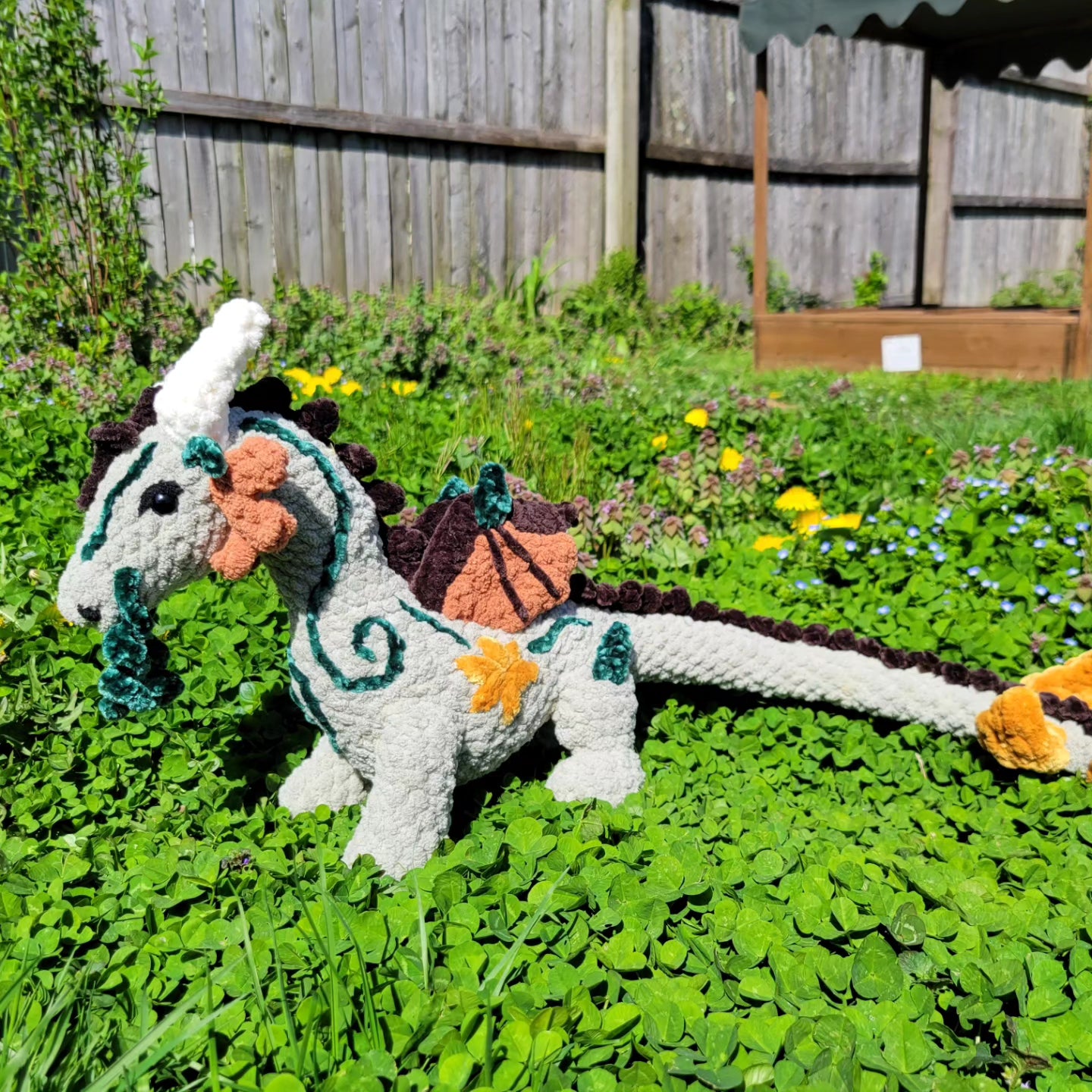 Made with soft and squishy blanket yarn. Accents are made with velvet yarn. About 27" long from the tip of his tail to his nose.