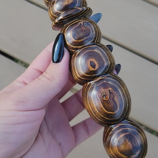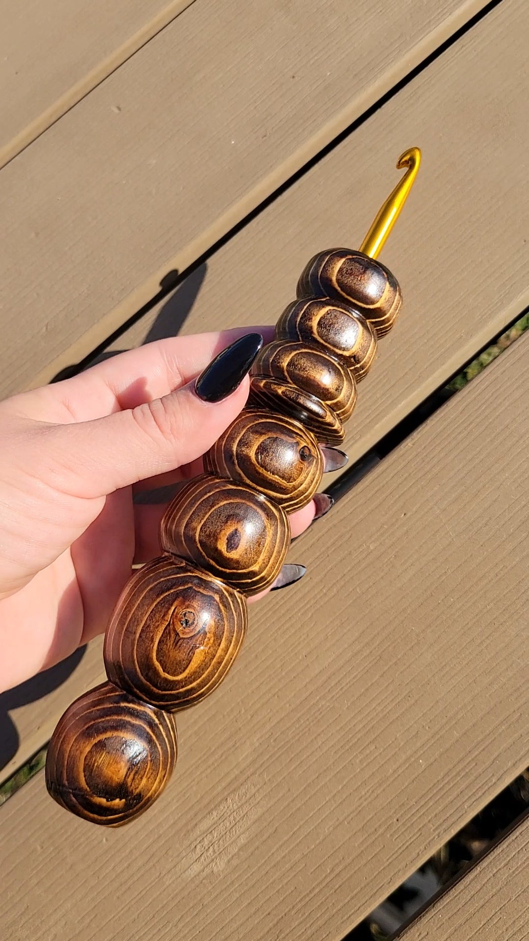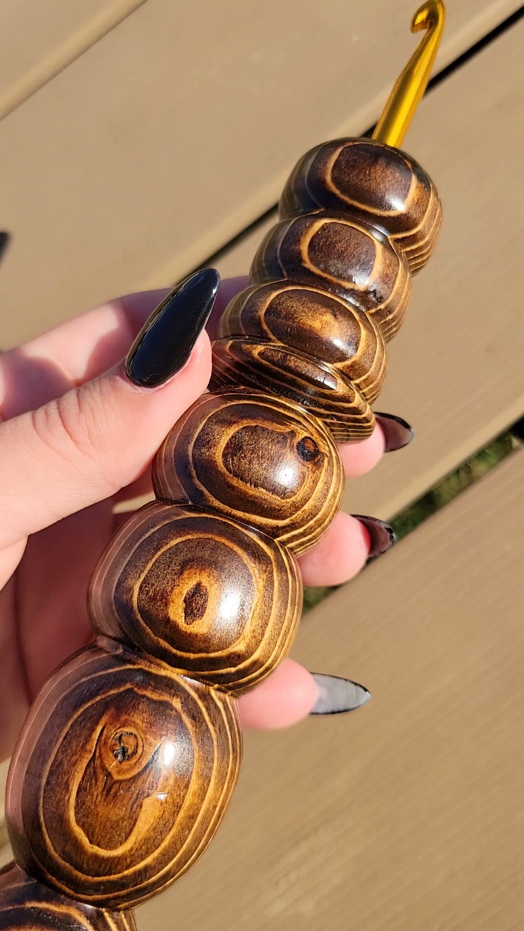 Hand-carved crochet hook handles set with 6mm gold colored hooks. Each one designed free-hand and unique from one another.